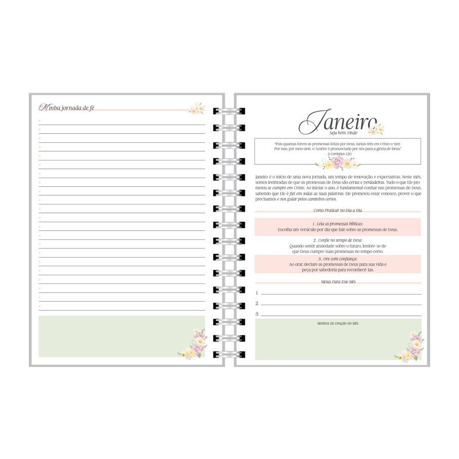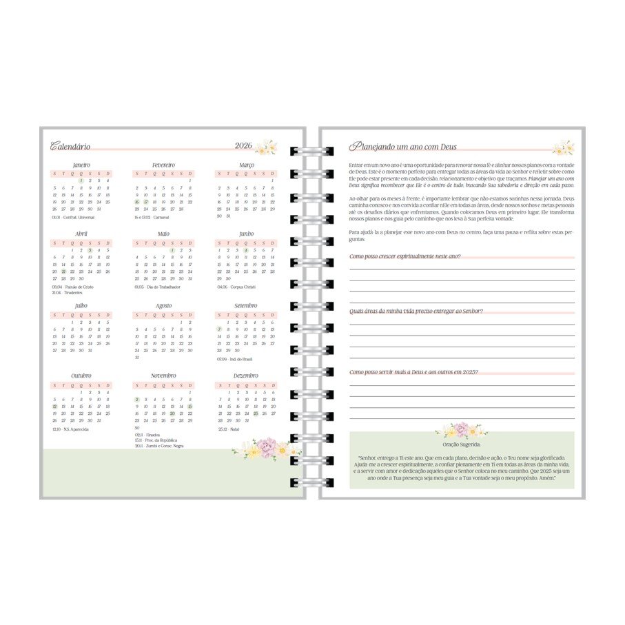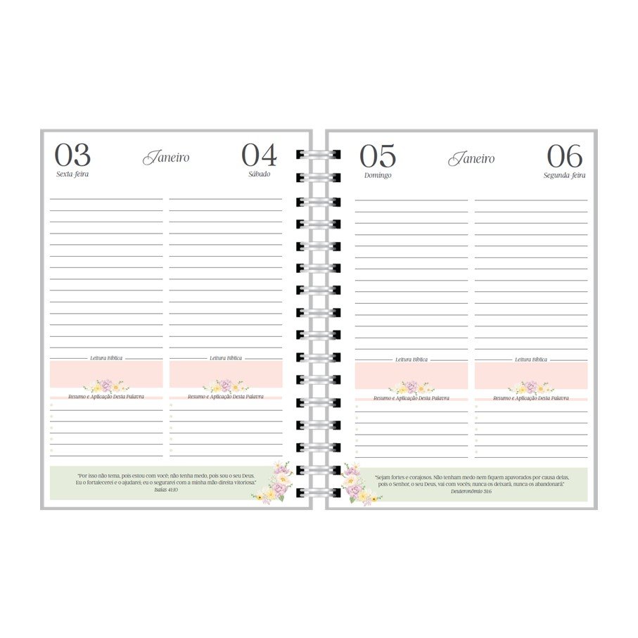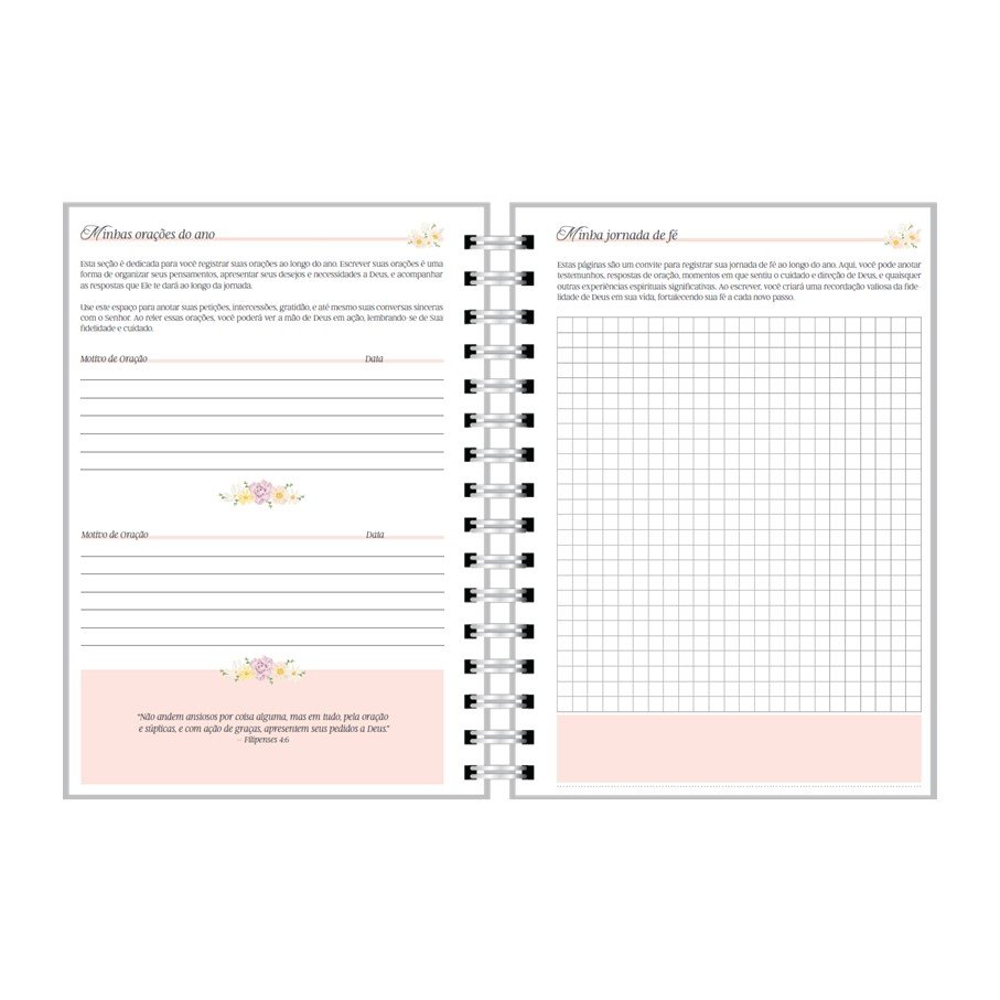 - Páginas com os dias, sendo dois dias por página, com espaço para agenda e devocional