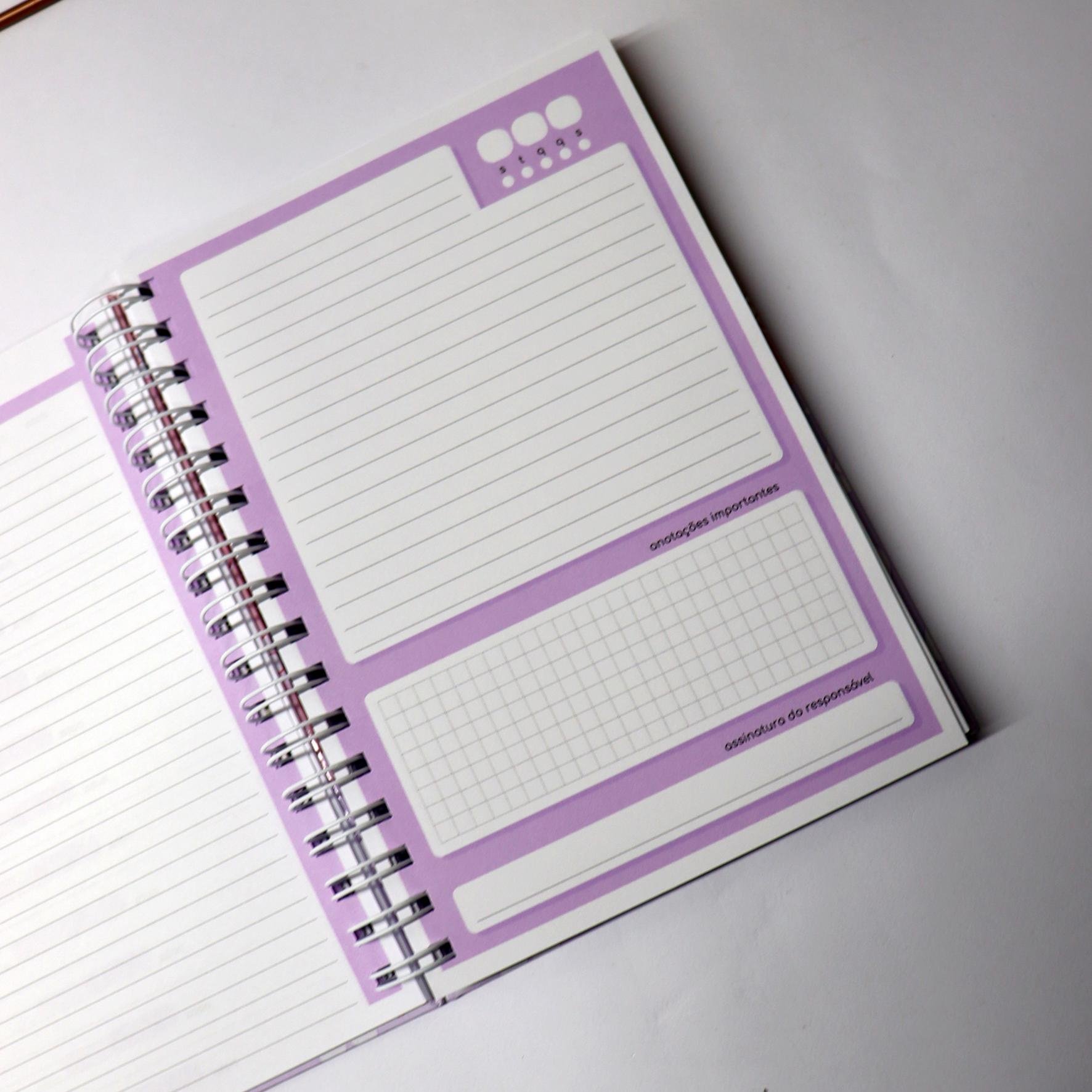 - Página diária, com espaço para: data, anotações importantes e assinatura do responsável