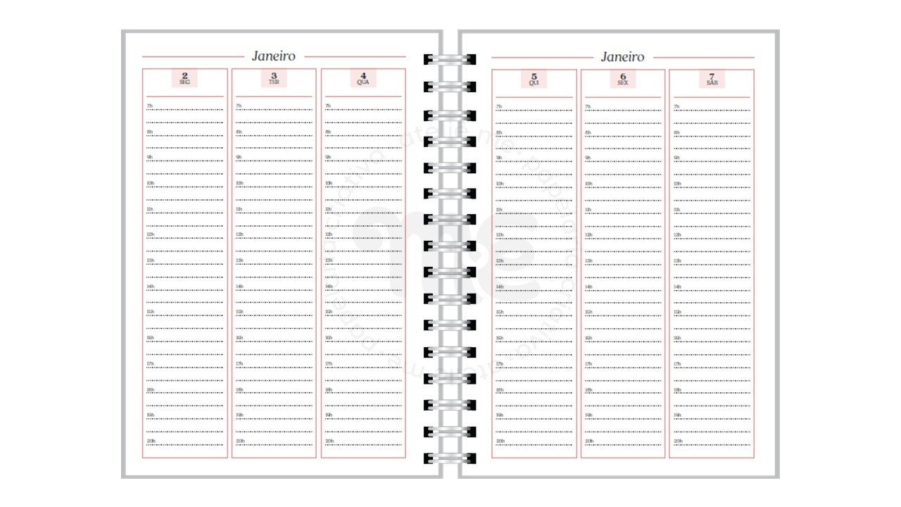 O caderno de agendamentos básico contém 114 páginas na versão Permanente Anual (3 dias por página).