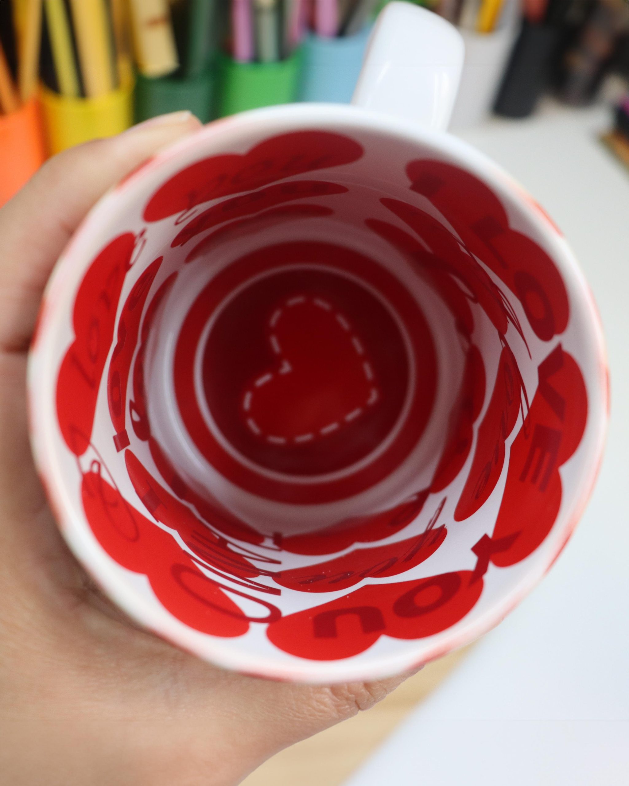 - Interior da caneca: Corações diversos tamanhos e formatos, em tons de rosa e vermelho