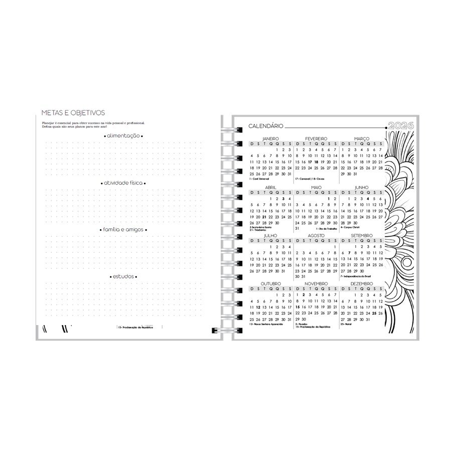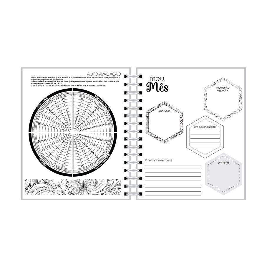O Planner coloring contém 192 páginas + 12 divisórias na versão datada.
