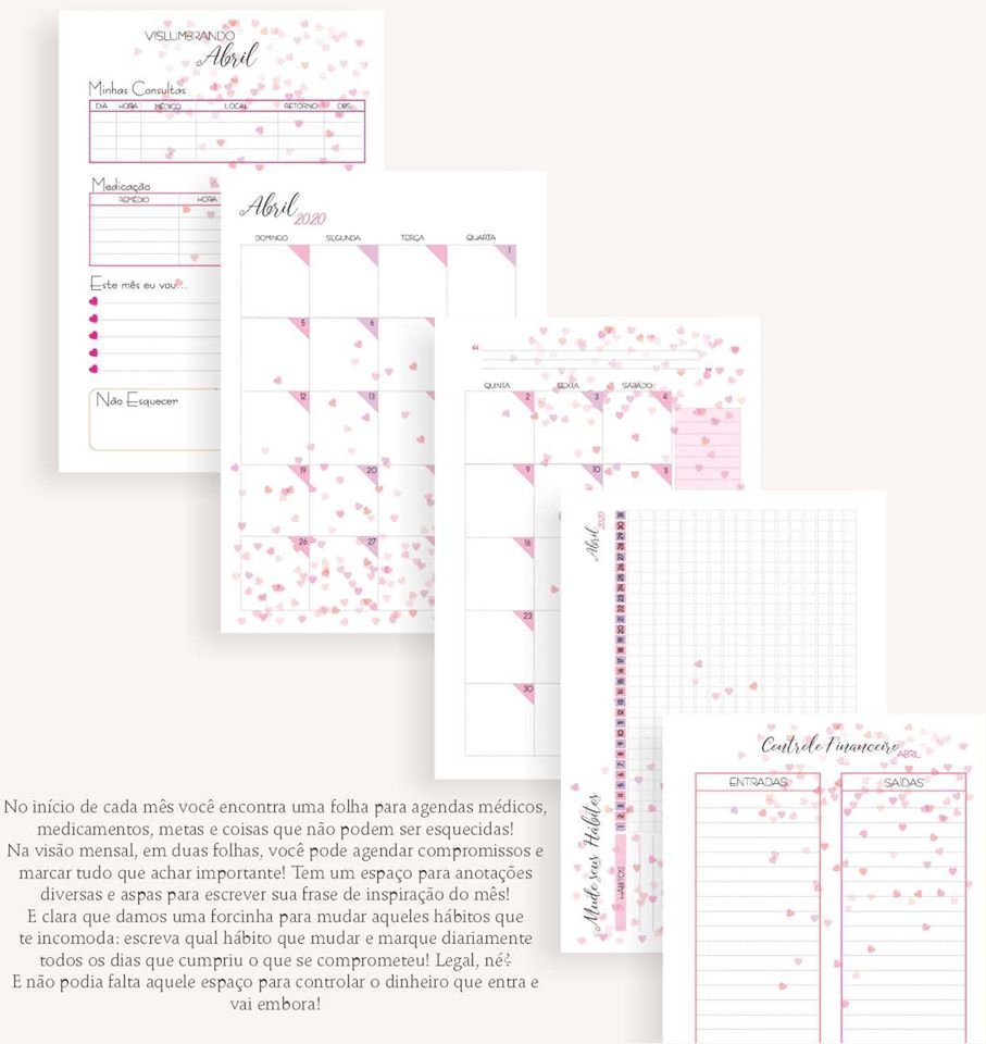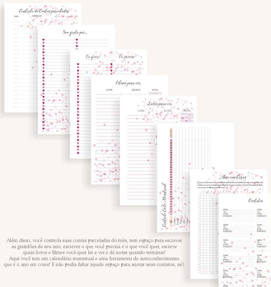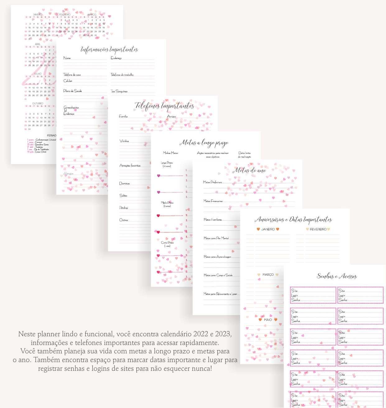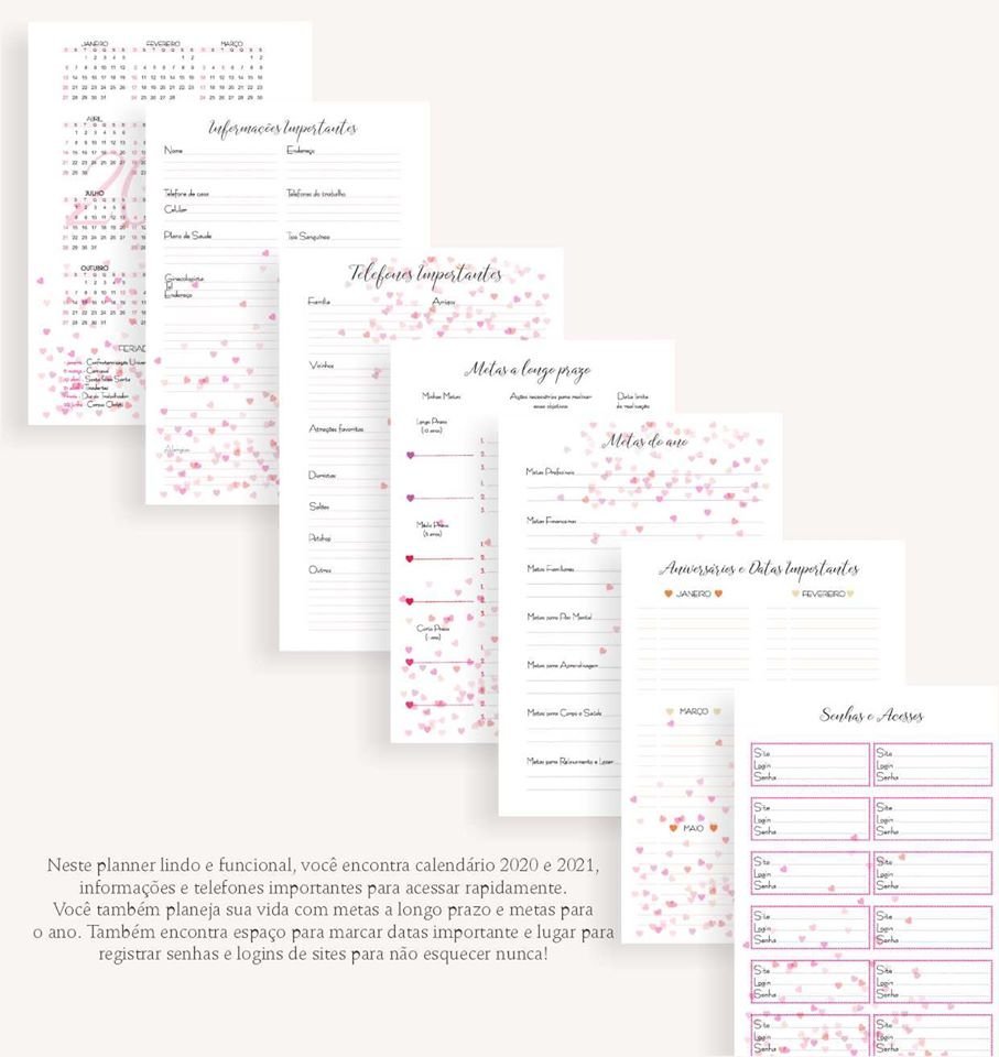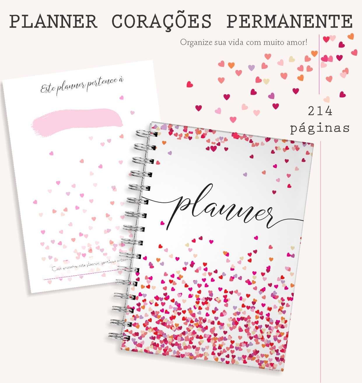 O Planner Permanente de corações contém 200 páginas + 12 divisórias na versão Permanente