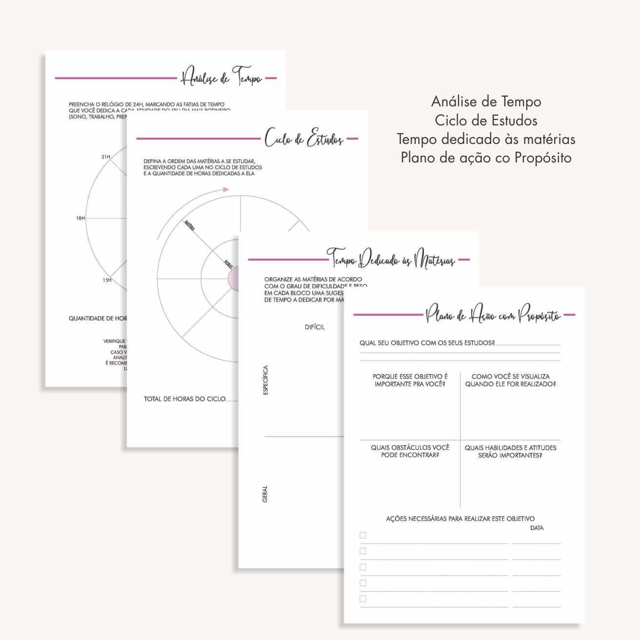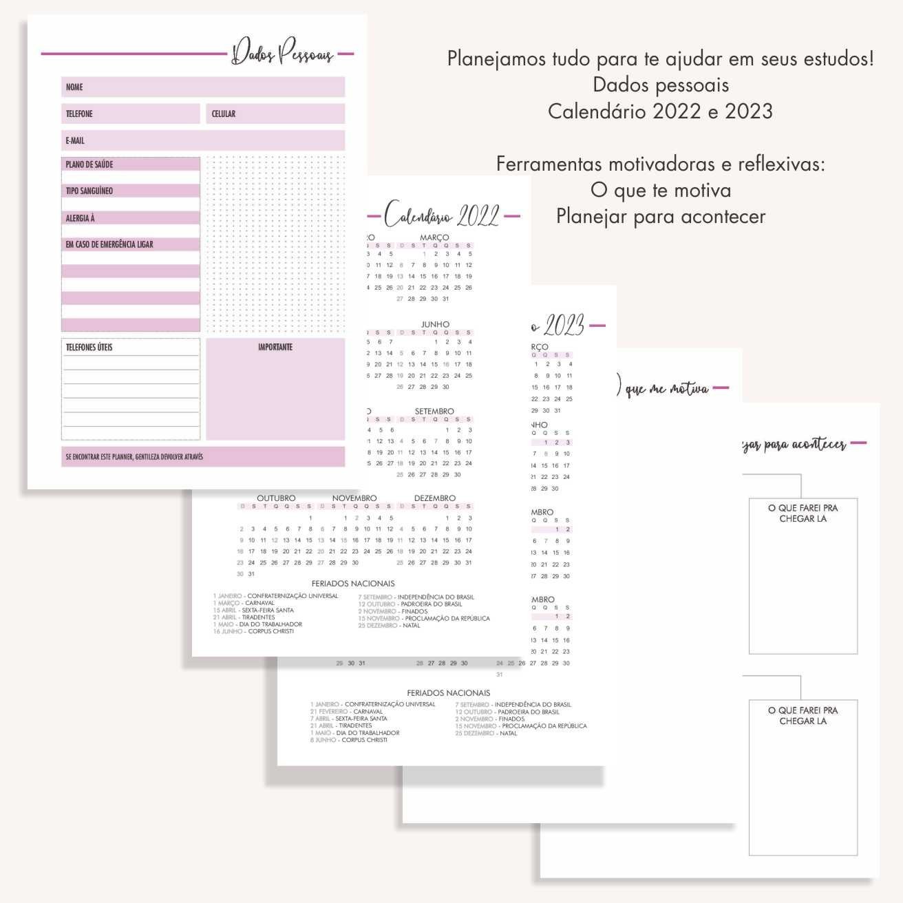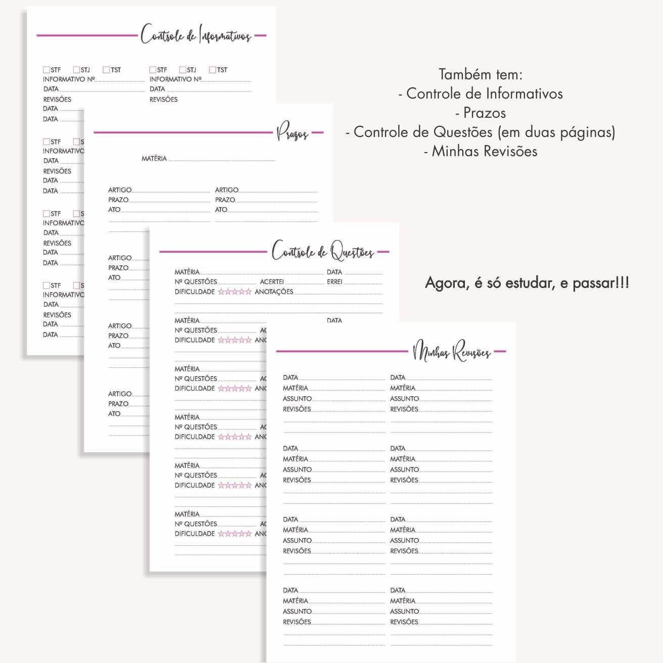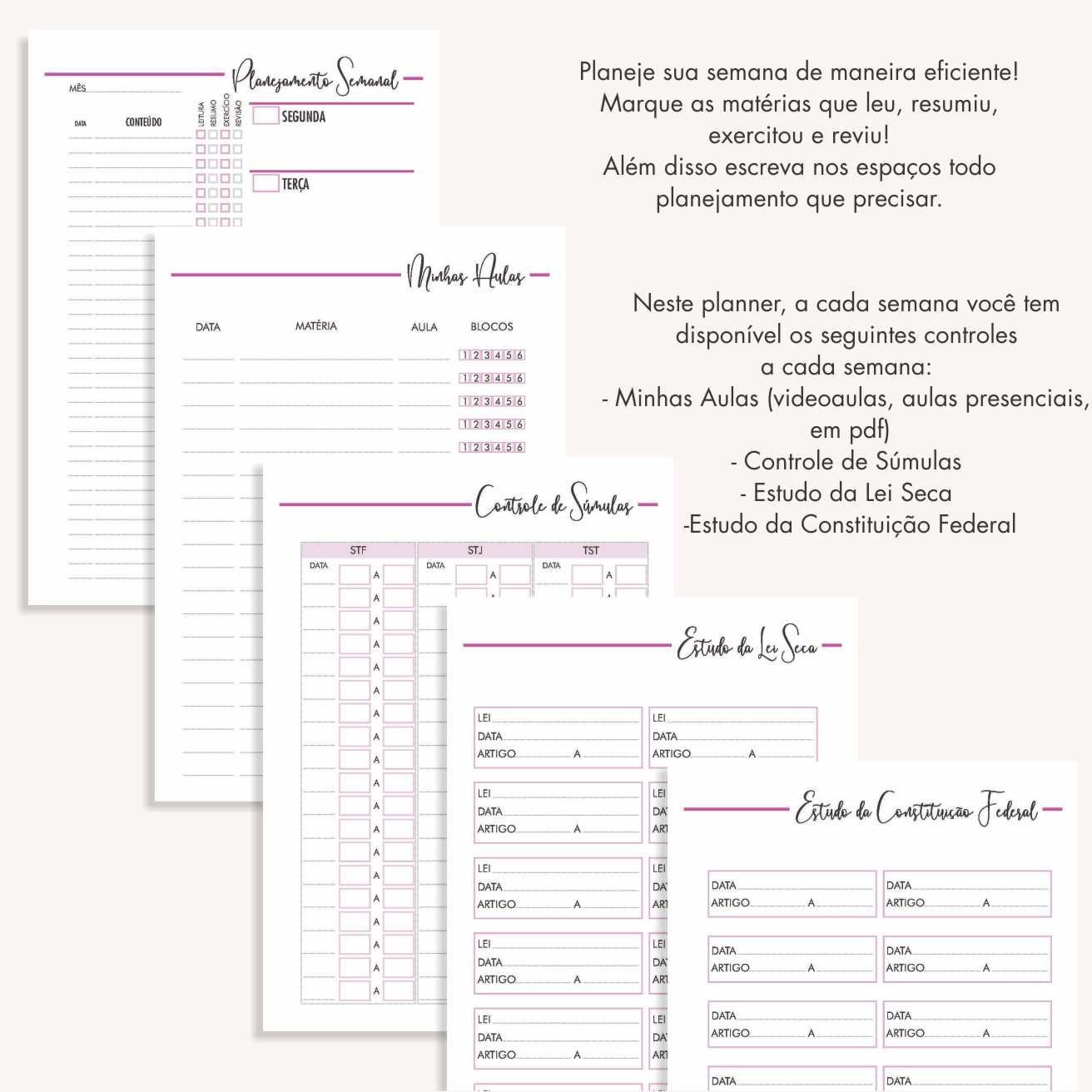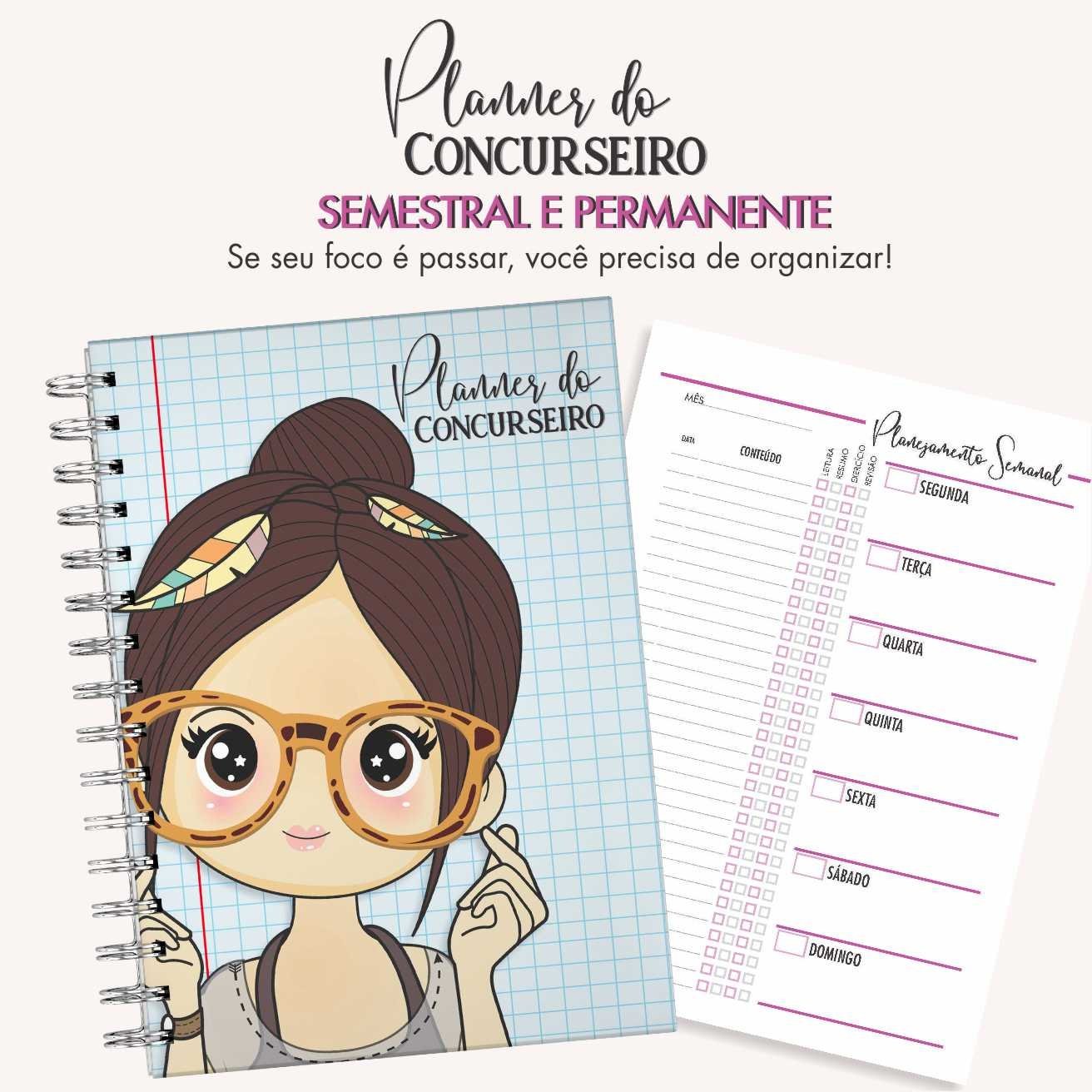 O planner do concurseiro é semestral e o miolo é na cor lilás ou cinza, a cada semana você encontra: