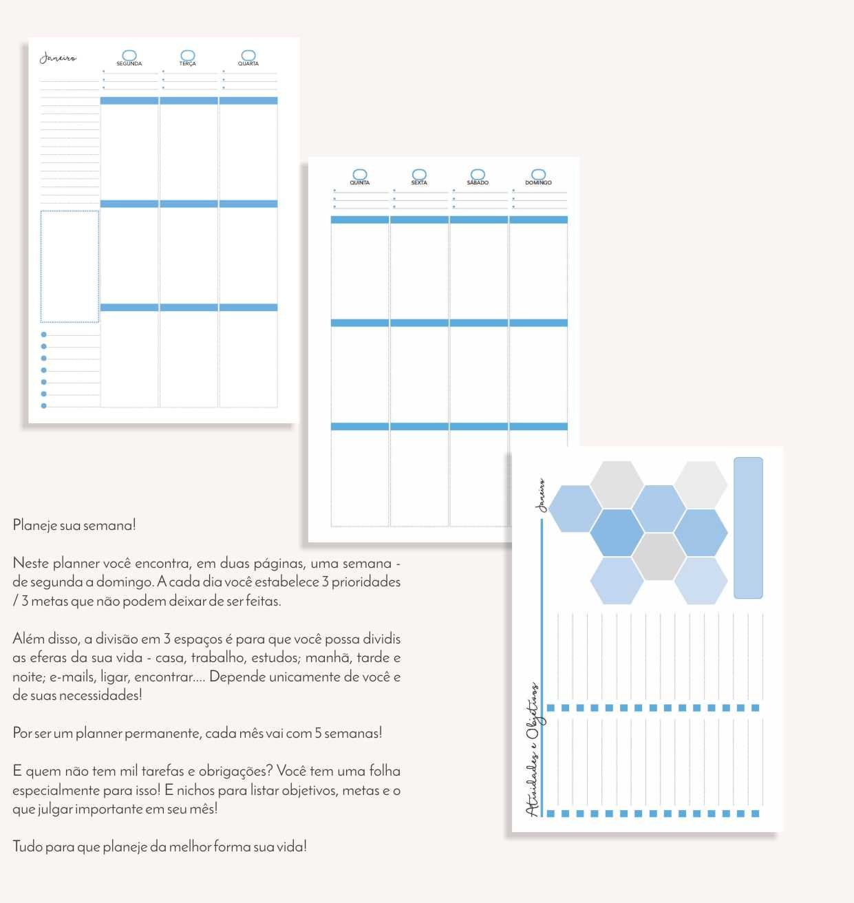 Planejamento diário dividido em três partes para que você utilize como melhor se adaptar a sua vida (manhã, tarde, noite – vida pessoal, profissional e acadêmica, por exemplo). O planejamento semanal é de segunda a domingo em duas páginas.